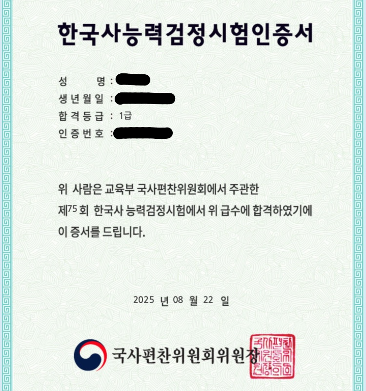 한국사를 좋아하는 편은 아니었지만 수능은 1등급 받았었다.